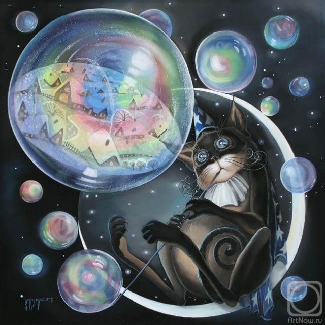And sits blowing bubbles.